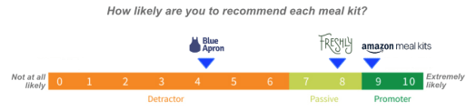 Using the Net Promoter Score scale for each of the three, rating how likely I am to recommend each kit on a scale of 0 to 10, here’s where I personally land on ratings for Amazon, Freshly, and Blue Apron.
