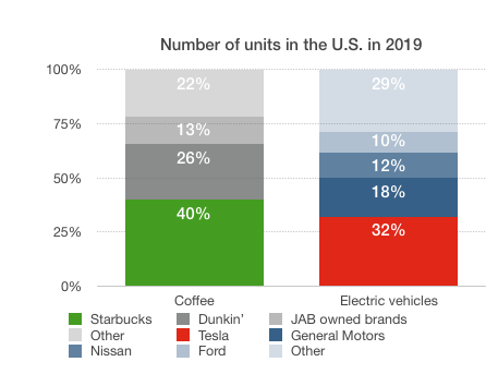 Starbucks and Tesla are on track to achieving similar market share in the U.S. Tesla announced in their Q4 earnings call that they expect to sell over 500,000 vehicle in 2020. This 50% bump in year-on-year global fleet growth will position Tesla to gain market share of the U.S. EV market comparable to Starbucks’ share of the U.S. coffee market.